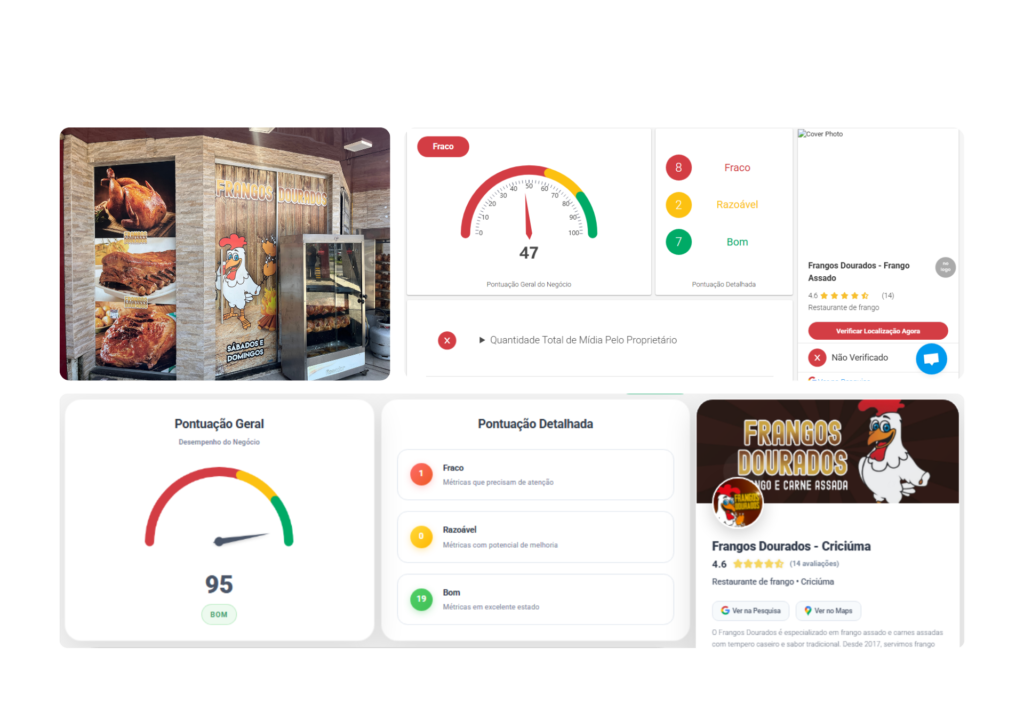 Agora está com o perfil totalmente otimizado, fotos estratégicas, site integrado ao Google e todas as avaliações respondidas, o Frangos Dourados saiu de 47 para 95 pontos de otimização, ampliando sua visibilidade no Google Maps e na busca local. Todas essas oportunidades foram identificadas após a análise com o Método Lupa.